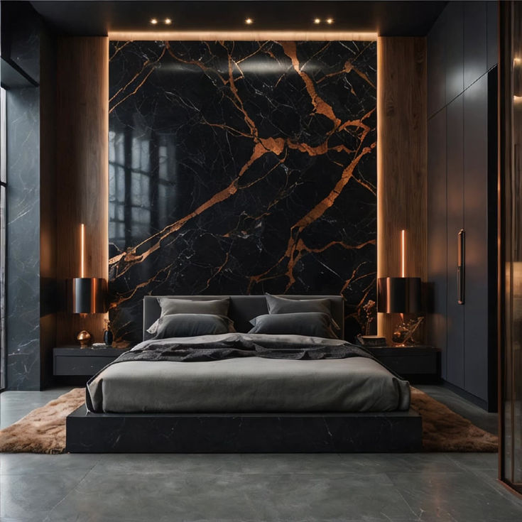 Materials and Colors: Polished black marble with copper veining dominates the villa, creating a dramatic yet inviting atmosphere. This is complemented by charcoal and deep grey hues, providing an elegant and cohesive backdrop.